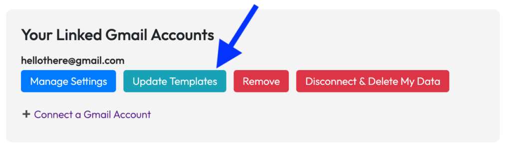 Whenever you add new draft templates or modify existing ones in your Gmail account, make sure you sync that back with Promptly Mail. To do this, just log in to your dashboard and, in the Your Linked Gmail Accounts section, click the Update Templates button for the corresponding Gmail account.